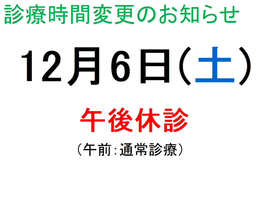 お知らせ 診療時間変更のお知らせ 2025.11.14 12月6日(土)は、午後休診となります。午前の診察時間は通常通り午前9時から12時まで診察致します。ご迷惑をおかけしますが、よろしくお願い致します。