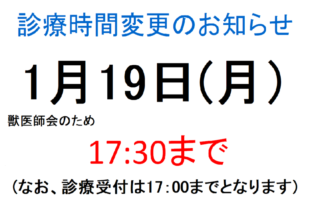 お知らせ 診察時間変更のお知らせ 2025.12.22 1月19日(月)は、獣医師会のため、午後の診察時間は17:30までとなります。午前の診察時間は通常通り9~12時です。ご迷惑をおかけしますが、よろしくお願い致します。