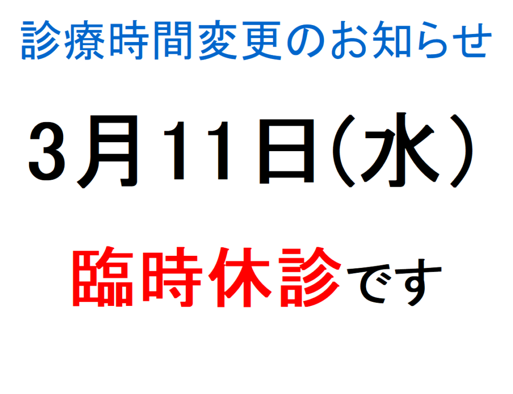 お知らせ 診察時間変更のお知らせ 2026.02.20 3月11日(水)は、臨時休診となります。火曜日、水曜日が休診となりますのでお薬やフードはお早めに取りにいらしてください。ご迷惑をおかけしますが、よろしくお願い致します。