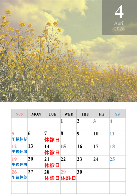 4月の休診日は火曜(7日、14日、21日、28日)と祝日(29日)です。