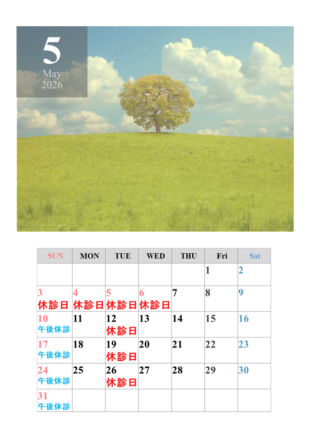 5月の休診日は、火曜日(12日、19日、26日)と、祝日(3日、4日、5日、6日)です。